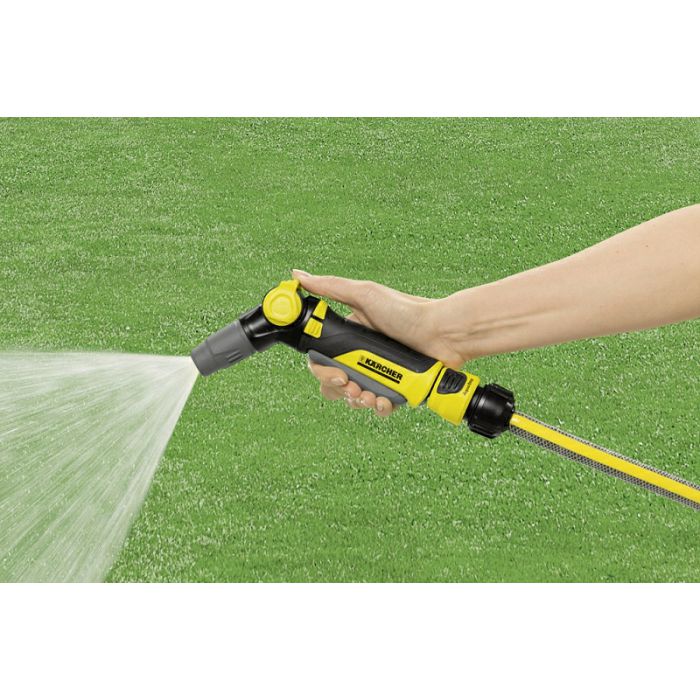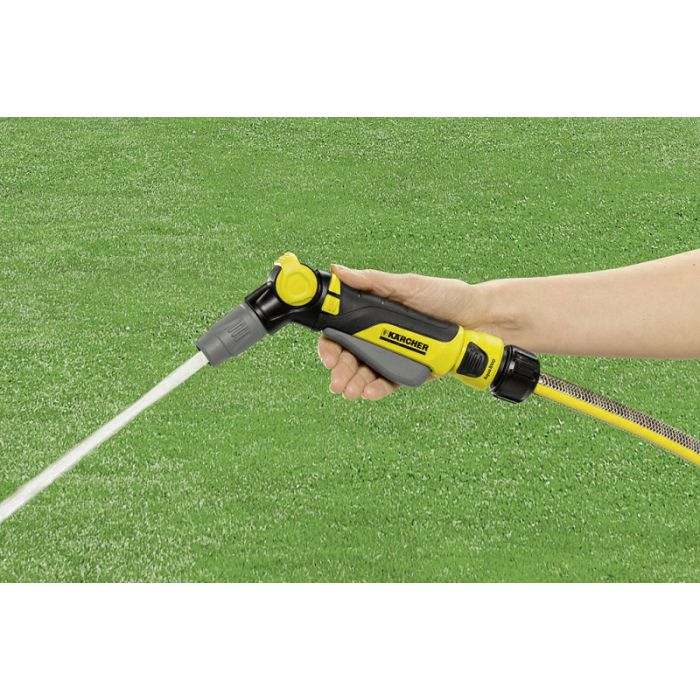 Samo vam Kärcher nudi toliko udobnosti: rotirajuća ručka, kojom možete usmjeriti okidač naprijed ili natrag s zaključavanjem/otključavanjem, omogućuje individualne mogućnosti korištenja pištolja za prskanje. Osim toga, sastoji se od mekanih plastičnih elemenata koji vam pružaju dodatnu zaštitu. Uz pomoć regulacijskog ventila, kojim se upravlja jednom rukom, možete podesiti i odgovarajući protok potrebne količine vode. Plus pištolj za prskanje ima 2 vrste mlaza: točkasti i konusni mlaz. Ova dva se mogu beskonačno podešavati prema potrebama - na primjer za zalijevanje cvjetnjaka i gredica s povrćem ili za uklanjanje grube prljavštine s terasa ili vrtnog namještaja. Dodajmo: Kärcher mlaznice za prskanje kompatibilne su sa svim dostupnim klik sustavima i mogu se jednostavno spojiti na vaša vrtna crijeva.