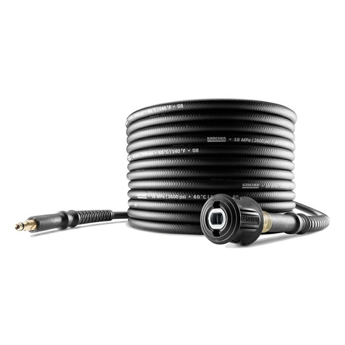 Produžetak crijeva visokotlačnog pištolja s Quick Connect adapterom. 10 m dugačak produžetak za visokotlačno crijevo osigurava visoku fleksibilnost i povećava raspon rada visokotlačnog čistača. Jednostavno spojite pištolj s Quick Connect spojnicom i visokotlačno crijevo - odmah ćete raditi još bolje. Robusna cijev DN 8 ojačana je tekstilnom mrežicom, a ima i zaštitu od savijanja cijevi te mesinganu spojnicu za dugi vijek trajanja. Nastavak visokotlačnog crijeva podnosi tlak do 180 bara i prikladan je za temperature do 60 °C. Produžetak crijeva se naravno može koristiti i sa sredstvima za čišćenje. Nastavak je kompatibilan s Kärcher visokotlačnim čistačima klase K 3 - K 7 s Quick Connect adapterom.
