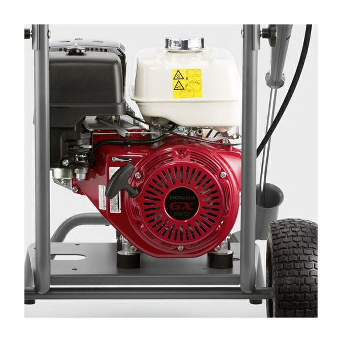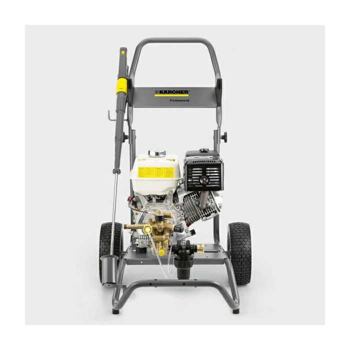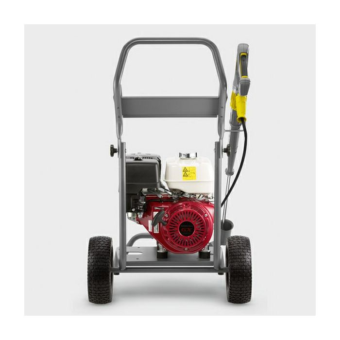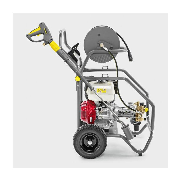 i Honda benzinskim motorom možete raditi samostalno, mobilno i udobno - čak i u teškim vanjskim uvjetima. Opremljen Honda benzinskim motorom, visokotlačni čistač s hladnom vodom HD 9/23 G radi potpuno neovisno o dovodu struje. Razvili smo ga za najbolje rezultate čišćenja - zahvaljujući tlaku vode od 230 bara, čistač, koji je zaštićen stabilnim osnovnim okvirom, savršeno će vam poslužiti čak i u izuzetno zahtjevnim uvjetima. Ergonomski dizajniran koncept okvira također nudi maksimalnu mobilnost čak i na neravnom terenu. Transportni kotači, uspješan koncept rada i razne mogućnosti pohrane pribora potvrđuju našu namjeru da vam ponudimo udoban rad čak i u teškim okolnostima. To potvrđuje i visokotlačni pištolj EASY!Force, koji koristi reaktivnu silu mlaza visokog tlaka i time smanjuje silu držanja na nulu, te brzootpuštajući zatvarači EASY!Lock, koji montažu i demontažu čine 5 puta bržom od tradicionalnih vijčanih spojeva. Snažna pumpa također vam omogućuje pumpanje vode iz jezera ili ribnjaka u hitnim slučajevima. Veliki filter za vodu i termički ventil koji sprječava pregrijavanje uređaja osiguravaju pouzdan rad. Osim toga, možete naručiti i zaštitni okvir Cage s ušicama za utovar dizalicom ili set bubnja za crijevo za visokotlačni čistač iz posebne klase uređaja HD 9/23 G.