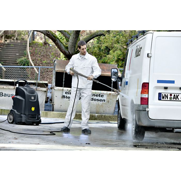 Visokotlačni čistač s vrućom vodom HDS 5/13 U Anniversary Edition u crnoj boji impresionira radnim tlakom od 130 bara, izvanrednom upravljivošću i ergonomijom zahvaljujući uspravnom dizajnu.