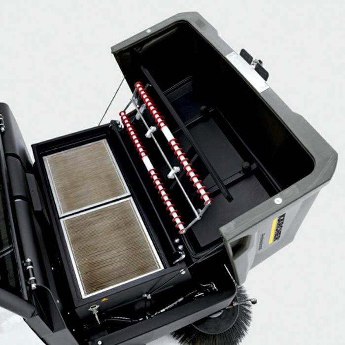 KM 130/300 R Bp Pack radi na baterije s upravljanjem stražnjim kotačima. Uređaj ne radi glasno i ne emitira nikakve emisije. Princip rada kante za smeće omogućuje precizno i pouzdano metenje fine i grube prljavštine. Tijekom transportne vožnje, sakupljač smeća se automatski zatvara. Valjak za metenje automatski se prilagođava neravnim površinama i može se brzo zamijeniti bez upotrebe alata. Novo dizajnirani sustav za metenje smanjuje trošenje. Dva ravna filtera, koji su postavljeni u horizontalnom položaju, osiguravaju čist zrak čak i kada ima puno prašine. Čišćenje filtra odvija se pritiskom na gumb uz pomoć iznimno učinkovitog dvostrukog strugača. Filter je optimalno dostupan i ne trebate alate za njegovu zamjenu. Osnovnim funkcijama vrlo je jednostavno upravljati uz pomoć koncepta EASY-Operation pomoću okretnog gumba.