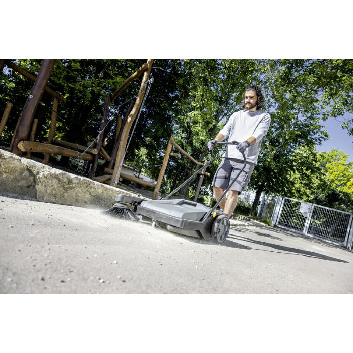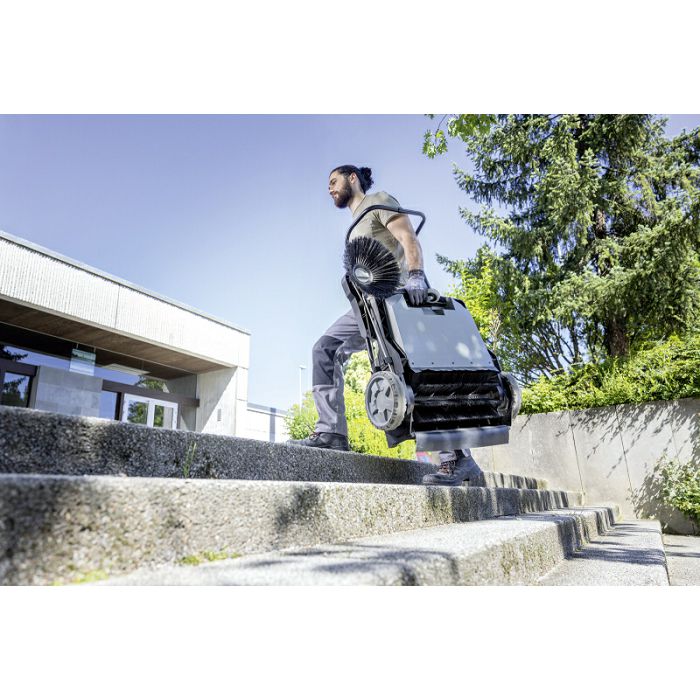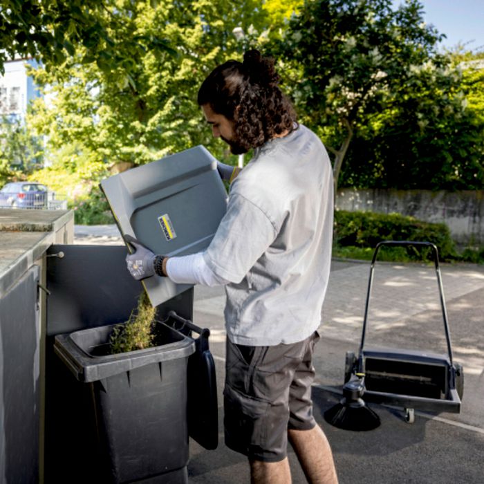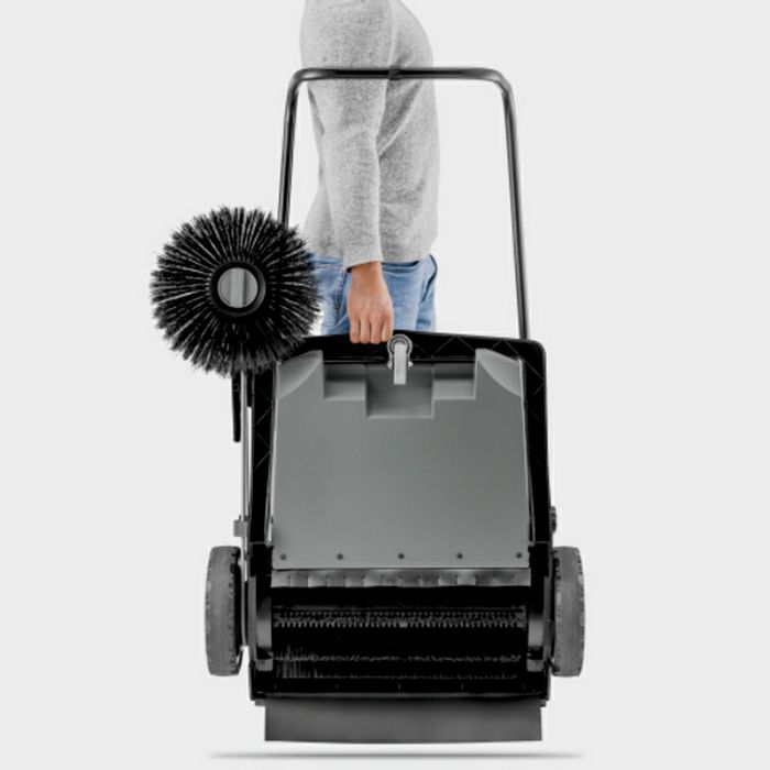 S kompaktnom ručnom čistilicom KM 70/15 C Classic možete jednostavno i praktično čistiti sve unutarnje i vanjske prostore. Mnogo je učinkovitiji od metle pri čišćenju površina od 100 četvornih metara ili više. Mala težina i nizak otpor kotrljanja kotača omogućuju lako manevriranje i transport. Valjak za metenje pokreće lijevi kotač, što osigurava pouzdan transport otpada do spremnika za metenje. Bočna četka je dizajnirana za čišćenje rubova i kutova. Prilikom čišćenja otvorenih prostora, možete ga preklopiti kako biste smanjili neželjeno nakupljanje prašine. Bočna četka se može podesiti kako bi se spriječilo trošenje. Prilikom zamjene četke nije potreban alat. Spremnik za otpad može se ukloniti i isprazniti u trenutku. Prednja strana spremnika je dizajnirana tako da se po potrebi može postaviti u uspravan položaj. Sklopiva ručka za guranje može se prilagoditi visini operatera i potpuno se sklapa u ravninu za uštedu prostora prilikom skladištenja KM 70/15 C Classic.