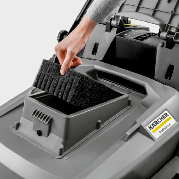 Ručni čistač KM 70/25 C za čišćenje unutarnjih i vanjskih tvrdih površina - električni pogon valjaka za metenje s filtrom i baterijom te pogon bočne četke smanjuju prašinu i povećavaju udobnost.