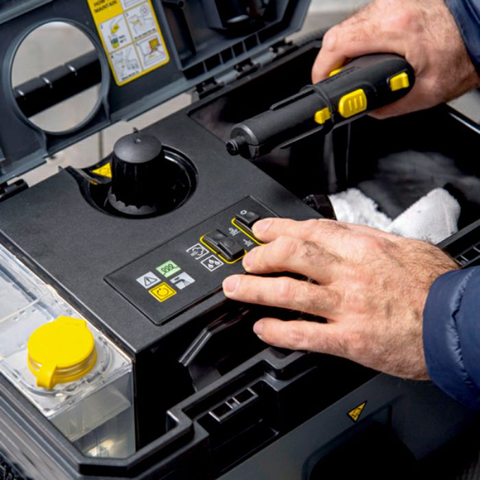 Kärcherova 90. obljetnica: parni čistač SG 4/2 Classic Anniversary Edition u crnoj boji impresionira izvrsnim rezultatima čišćenja, fantastičnim omjerom cijene i kvalitete te visokom učinkovitošću. Jedinstveni dizajn kutije "sve u jednom" robustan je i izdržljiv. Težak samo 7,5 kilograma, najkompaktniji je profesionalni parni čistač u svojoj klasi, spreman za korištenje za samo 3 minute i jednostavan za korištenje. S tlakom pare od 4 bara, uređaj nudi dovoljnu rezervu za temeljito čišćenje i dezinfekciju bez ikakvih kemijskih dodataka. Površine poput radnih ploča, sustava za točenje pića, pločica, ploča za kuhanje i pećnica ostaju besprijekorno čiste. VapoHydro funkcija prekidača za toplu vodu dostupna je za posebno tvrdokornu prljavštinu i masnoću. Uklonjivi spremnik za vodu lako se puni. Uređaj pohranjuje širok raspon pribora, uključujući crijevo za paru, ručnu mlaznicu, točkastu mlaznicu, električnu mlaznicu, okruglu četku, ravnu četku, strugač za paru i navlaku od mikrovlakana. Mlaznica za pod također je dostupna kao opcija. Jubilarno izdanje također uključuje parni stroj za osvježavanje i zaglađivanje tekstila poput odjeće i zavjesa.