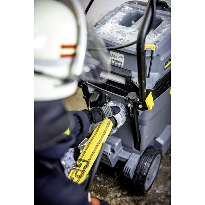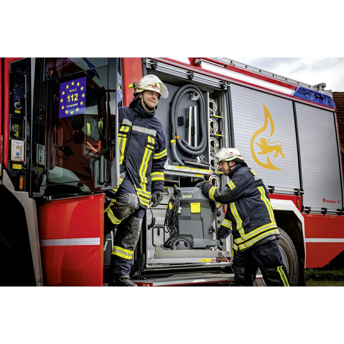 Iznimno snažan, robustan i jednostavan za transport: Kärcher usisavač za mokro i suho čišćenje NT 50/1 Mwf zadovoljava i najviše zahtjeve vatrogasne službe. Opremljen spremnikom od 50 litara, metalnim upravljačkim kotačima/kotačima i beskonačno podesivom ručkom za guranje, mobilni stroj može brzo biti na mjestu incidenta, gdje je odmah spreman za upotrebu zahvaljujući C-spojnici za spajanje svih uobičajenih vatrogasnih crijeva. Pumpa za otpadne vode pumpa do 330 litara vode u minuti – idealno za brzo uklanjanje velikih količina vode, na primjer tijekom gašenja požara ili poplava. Osobni sigurnosni prekidač PRCD-K s IP68 utikačem, posebno dizajniran za upotrebu s električnim generatorima, i košara filtera za grubu prljavštinu, koja učinkovito štiti pumpu za otpadne vode od začepljenja uzrokovanih usisanim kamenjem, lišćem ili drvetom, osiguravaju sigurnost svih uključenih i stroja. Osim toga, usisavač za gašenje požara NT 50/1 Mwf opremljen je usisnim crijevom otpornim na ulje i visokokvalitetnom aluminijskom podnom mlaznicom.