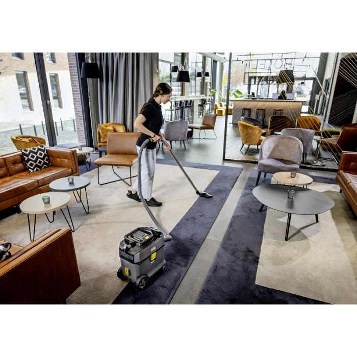 Akumulatorski usisavač za suho usisavanje Kärcher T 15/1 Bp impresionira svojom izdržljivošću, izdržljivošću i atraktivnim omjerom cijene i kvalitete. Također se odlikuje robusnošću, opsežnim priborom i izvrsnom snagom usisavanja zahvaljujući snažnim baterijama Kärcher Battery Power+ (36 V). 45 posto recikliranog materijala* korištenog u proizvodnji štedi resurse i smanjuje potrebe za energijom. Snažni T 15/1 Bp odlikuje se tihim radom (57 dB[A]), tako da se može koristiti u bilo koje vrijeme, čak i na mjestima osjetljivim na buku. Kompaktni usisavač je okretan i otporan na prevrtanje, a spremnik ima kapacitet od 15 litara. Ima ručku za nošenje s funkcijom sklapanja i može se nositi ergonomski i uz tijelo. Također je izuzetno robustan, kao i šasija, karoserija, branik i veliki kotači. Alat za proreze koji je uključen u opseg isporuke uvijek se može pohraniti na dohvat ruke na usisavaču. Ultra-učinkoviti HEPA 14 filtar također je dostupan na zahtjev. Prilikom naručivanja imajte na umu da se baterija i kompatibilni brzi punjač moraju naručiti zasebno za ovu verziju stroja.