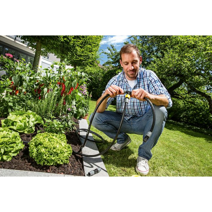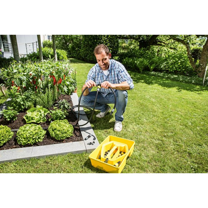 Kärcher Rain Box idealan je ulaz u svijet učinkovitog, ekonomičnog i optimalnog navodnjavanja vrta. Komplet sadrži priključak za slavinu G1 s reduktorom G3/4 za spajanje na slavinu za vodu, 2 spojnice, 1 filtar, crijevo Kärcher Rain System® od 15 m (kao dovodno crijevo i crijevo za postavljanje manžeta), crijevo za kapanje od 10 m, 4 T-elementi s regulacijom, 4 I-elementa, 10 drip manžeta i 5 klinova za pričvršćivanje cijevi. Svi dijelovi se mogu montirati bez potrebe za alatima. Po želji se na crijevo Kärcher Rain System® mogu postaviti manžete za kapljanje. Podesivi su (0-10l/h). Cijev za kapanje kaplje ravnomjerno cijelom dužinom i može se optimalno namjestiti pomoću podesivog odvoda na T-elementu. Sustav radi s tlakom do 4 bara, može se individualno prilagoditi prema pojedinačnoj vrsti vrta i savršeno radi sa SensoTimerom za reguliranje zalijevanja prema potrebama.