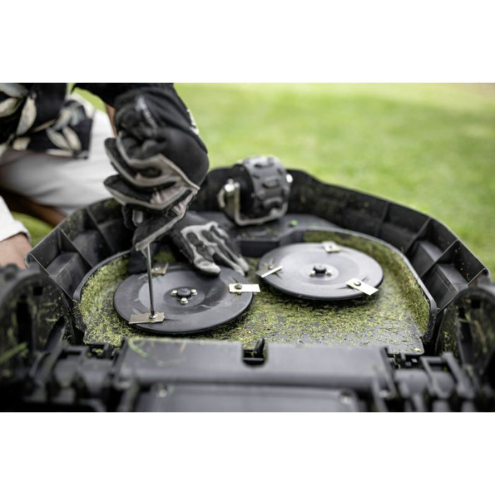Noževi robotske kosilice trebali bi se mijenjati svakih jedan do dva mjeseca kako bi se osigurala učinkovita košnja i zdrav travnjak. Oštrice su obostrano potpuno naoštrene i kaljene, što osigurava duži vijek trajanja. Komplet se sastoji od 12 zamjenskih oštrica i 12 vijaka koji se lako mogu ručno zamijeniti, što omogućuje jednostavnu zamjenu oštrice.