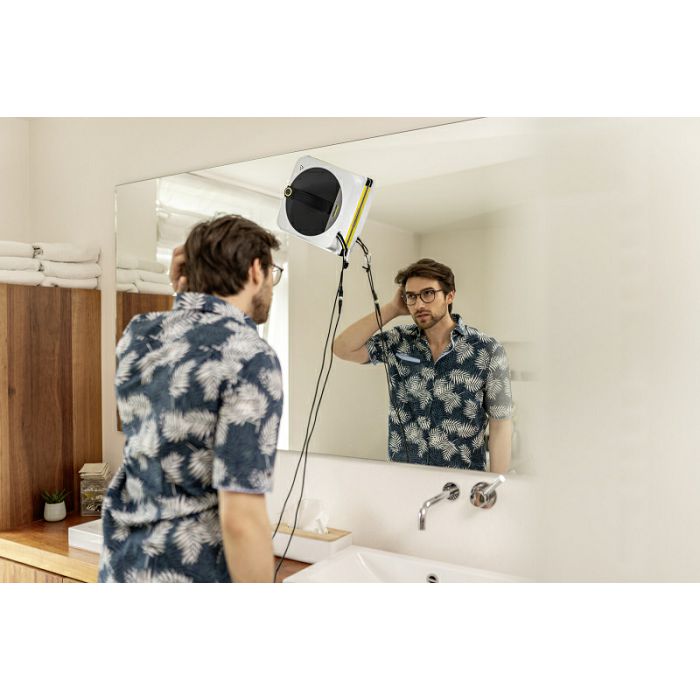 Robot za čišćenje prozora RCW 4 zamjenjuje ručno čišćenje velikih i teško dostupnih prozora i osigurava jasan pogled. Zahvaljujući svojoj snažnoj vakuumskoj tehnologiji, osigurava sigurno prianjanje na svim glatkim površinama, uključujući ogledala i tuš kabine. Čak se i staklene površine bez okvira brzo i pouzdano čiste zahvaljujući sustavnoj navigaciji s četiri senzora za detekciju okvira, predmeta i rubova. Za najbolje rezultate, krpa od mikrovlakana kontinuirano se i precizno navlaži otopinom za čišćenje pomoću šest mlaznica za raspršivanje koje se pokreću pumpom. Izravno vlaženje sprječava stvaranje kapljica i njihovo otpuhivanje vjetrom. Ovisno o stupnju zaprljanosti, mogu se odabrati četiri automatska načina čišćenja i jedan ručni način rada, kojima se može praktično upravljati pomoću daljinskog upravljača. LED signali i glasovni izlaz pružaju precizne informacije o statusu uređaja, na primjer kada je spremnik deterdženta prazan. Isporučeni čistač prozora RM 503 pouzdano uklanja prljavštinu, suši bez tragova i omogućuje brže otjecanje kišnice za dugotrajnu čistoću. Čak i u slučaju nestanka struje, RCW 4 ostaje pričvršćen za prozor zahvaljujući rezervnoj bateriji i sigurnosnom kabelu.