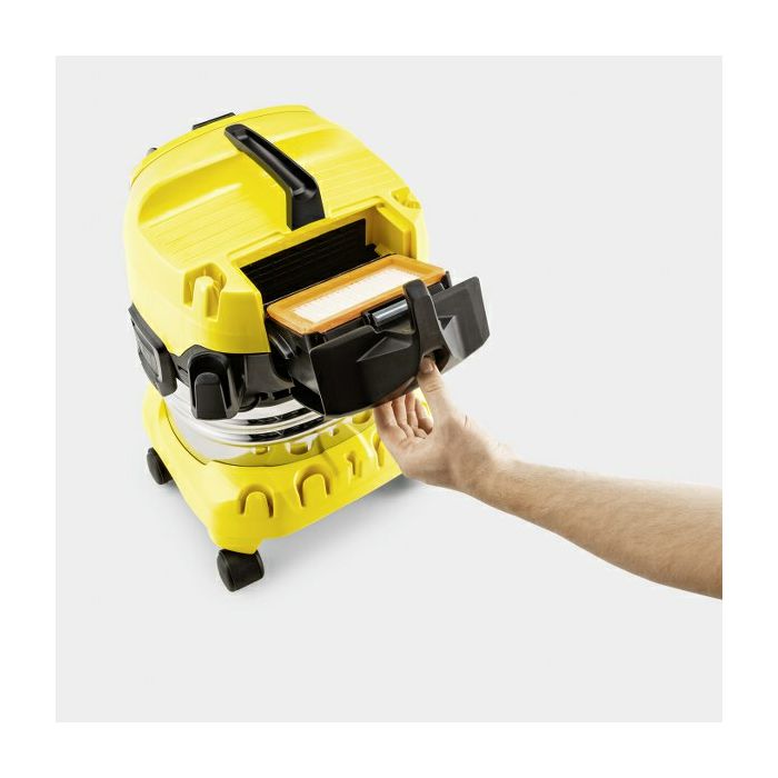 Iznimno snažan i energetski učinkovit s 1000 W: mokro/suhi usisavač WD 4 PS V-20/5/22, usisno crijevo i kopča za podnu mlaznicu optimalno su usklađeni za najbolje rezultate čišćenja. Mokra, suha, fina ili gruba prljavština uklanja se neprestano bez mijenjanja filtera. Uređaj dolazi s robusnom i otpornom posudom od nehrđajućeg čelika od 20 l, kabelom od 5 metara, usisnim crijevom od 2,2 metra, kopčom za podnu mlaznicu, ravnim naboranim filterom i vrećicom za filter od flisa. Integrirana utičnica s automatskim uključivanjem/isključivanjem olakšava rad s električnim alatima. Zahvaljujući patentiranoj tehnologiji, filter u mokro-suhom usisavaču može se brzo i jednostavno ukloniti - bez kontakta s prljavštinom. Dodatna funkcija puhanja pomaže tamo gdje usisavanje nije moguće. Uklonjiva ručka omogućuje izravno pričvršćivanje pribora na usisno crijevo. Crijevo se može kompaktno pohraniti na glavu uređaja. Crijeva i podna mlaznica također se brzo i praktično parkiraju na braniku. Druge prednosti uključuju sustav zaključavanja "Pull & Push" za jednostavno otvaranje i zatvaranje spremnika i ergonomski oblikovanu ručku za nošenje za udoban transport uređaja.