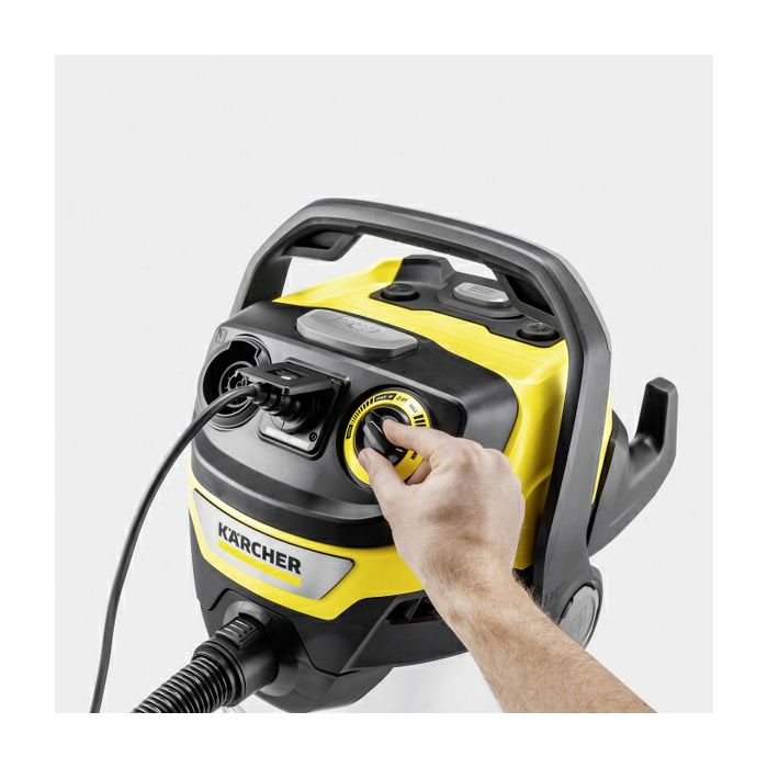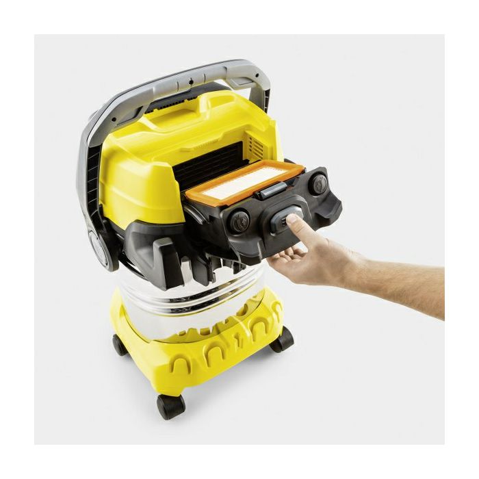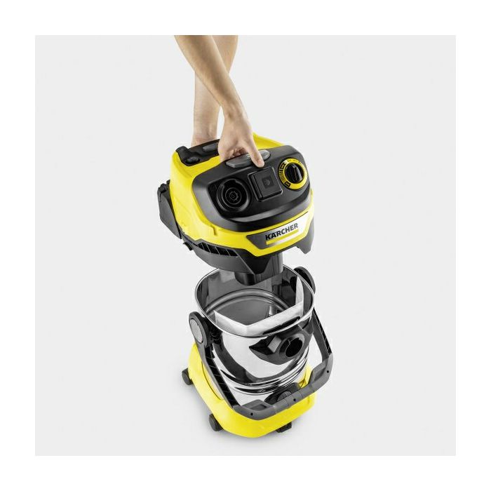 Izuzetno snažan usisavač WD 6 P S V-30/6/22T energetske učinkovitosti uz potrošnju energije od 1300 W nudi mokro i suho usisavanje sa spremnikom od nehrđajućeg čelika od 30 litara. Usisavač ima kabel od 6 metara i usisno crijevo od 2,2 m. Odvodni lijevak se koristi za praktično odvodnjavanje tekućina koje su usisane. Električni alati poput raznih pila i brusilica mogu se spojiti na montažer putem ugrađene električne utičnice s automatskim prekidačem za uključivanje/isključivanje. Okretni prekidač omogućuje podešavanje snage usisavanja prema potrebama primjene, a ravni naborani filtar može se ukloniti bez doticaja s prljavštinom. Štoviše, filtar možete učinkovito očistiti pritiskom na gumb za čišćenje kako biste vratili punu snagu usisavanja. Funkcija puhanja korisna je za čišćenje osjetljivih predmeta i na mjestima gdje je usisavanje teško. Ako uklonite produžnu cijev, možete pričvrstiti pribor izravno na usisnu cijev.