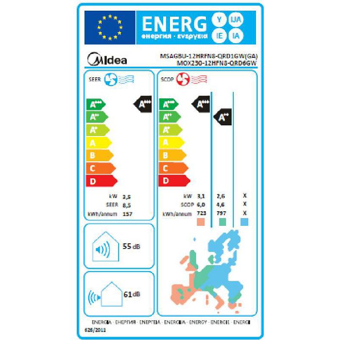 Klima uređaj Midea Xtreme Save Pro MSAGBU-12HRFN8-QRD1GW Carbon / MOX230-12HFN8-QRD6GW Energetska klasa: A+++/A++ Hlađenje (kW): 3,51 Grijanje (kW): 3,81 Hlađenje: -15 - 50 C Grijanje: -25 - 24 C Dimenzije unutarnje jedinice: 835 x 295 x 208 mm Dimenzije vanjske jedinice: 765 x 303 x 555 mm WiFi Filter visoke gustoće Cold catalyst filter UV lampa I clean Horizontalni i vertikalni auto swing klapni Low ambient kit funkcija 8C grijanje (zaštita od smrzavanja), pozlaćene lamele Eco način rada za uštedu energije Sleep mode Slijedi me funkcija Breeze away funkcija Gear funkcija Odvod kondenzata na 2 strane Tihi način rada Autorestart Turbo način rada Timer Hitni način rada Detekcija curenja plina Grijač kompresora i grijač u tavici kondenzata Bio filter Niski nivo buke silnet mode 1 W standby Memorija položaja klapne