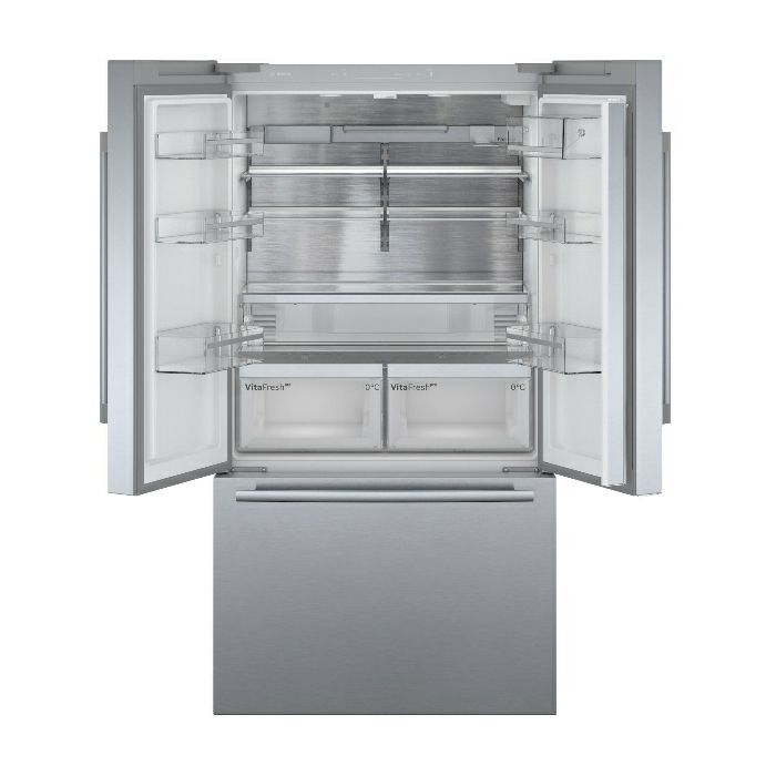 Bosch KFF96PIEP Hladnjak s francuskim vratima Vrata: nehrđajući čelik antiFingerPrint, stranice: srebrne boje Klasična vrata, Vrata: nehrđajući čelik antiFingerPrint Kućište: srebrne boje LED osvjetljenje hladnjaka Unutrašnjost opremljena sa metalnim aplikacijama Super hlađenje Automatsko odmrzavanje hladnjaka Režim rada Holiday Optički i akustički sistem upozoravanja kod otvorenih vrata Optički i akustički sistem upozoravanja kod povećanja temperature Multi Airflow-System AirFresh filter Broj polica za odlaganje od sigurnosnog stakla: 4, od toga 1 podesiva po visini, 1 djeljiva staklena polica 2 police na izvlačenje Br. velikih površina za odlaganje na vratima: 2, broj malih površina za odlaganje: 3 Ladica za maslac / sir Broj prozirnih pretinaca za zamrzavanje: 3 Automatska priprema za izradu kockica leda LED osvjetljenje unutrašnjosti zamrzivača Dimenzije (V x Š x D): 183 x 91 x 71 cm Država porijekla: Kina