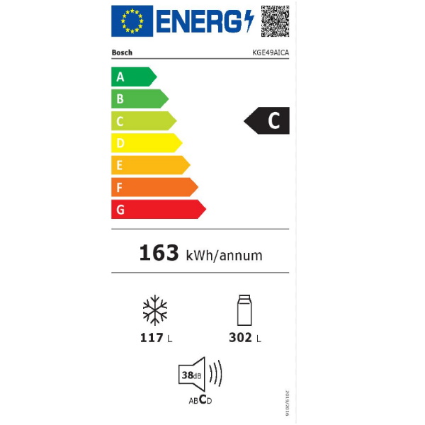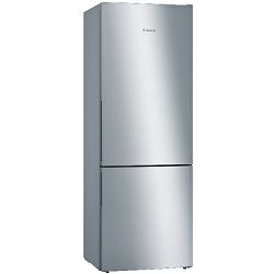 Bosch KGE49AICA Samostojeći hladnjak sa zamrzivačem na dnu, 201 x 70 cm, nehrđajući čelik (s premazom protiv otisaka prstiju) Vrata: nehrđajući čelik antiFingerPrint, stranice: Pearl grey (VZF 07127) Vertikalna ručka LED osvjetljenje hladnjaka Elektronska kontrola temperature s digitalnim prikazom Odvojeno upravljanje temperature u rashladnom i zamrzivačkom dijelu Akustički sistem upozoravanja kod otvorenih vrata Aktivni sigurnosni sistem s memorijskom funkcijom Režim rada Holiday Super hlađenje Automatsko odmrzavanje hladnjaka Prostor za hlađenje: 302 l Dinamičko hlađenje sa unutrašjim ventilatorom Br. površina za odlaganje od sigurnosnog stakla: 5, od toga podesive po visini: 2, 4 na izvlačenje Br. velikih površina za odlaganje na vratima: 1, broj malih površina za odlaganje: 3 Držač za boce Zona na oko 0°C, ukupni volumen od 28 l VitaFresh 0°C ladica - ribe i meso ostaju duže svježi VitaFresh ladica s podešavanjem vlažnosti - voće i povrće ostaju duže svježi Low Frost Prostor za zamrzavanje: 111 l Učinak zamrzavanja: 15 kg/24 h Pohranjivanje u slučaju kvarova: 44 h Br. prozirnih ladica za zamrzavanje: 3, od toga 1 BigBox Dimenzije (V x Š x D): 201 x 70 x 65 cm Desno otvaranje vrata, podesivo Sprijeda noge podesive po visini, straga kotačići Odvod odleđene vode Priključna snaga: 90 W Napon: 220-240 V Klimatski razred SN-T 2 x Akumulatori za hlađenje, 3 x Posuda za jaja Država porijekla: Turska