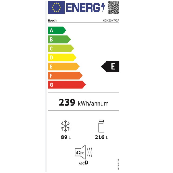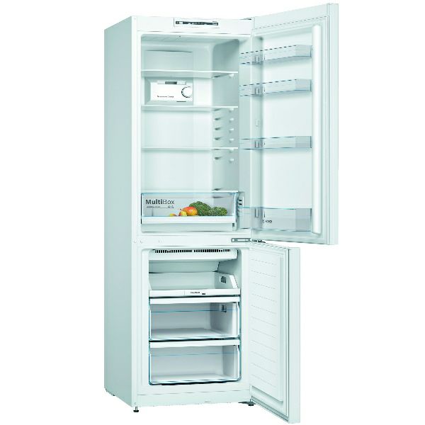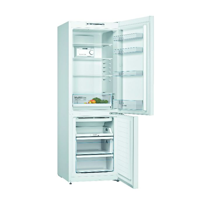 Bosch KGN36NWEA Samostojeći hladnjak sa zamrzivačem na dnu, visine 186 cm Vrata: bijela boja, stranice: bijele LED s Soft Start osvjetljenje hladnjaka NoFrost Elektronička regulacija temperature s LED prikazom Super zamrzavanje sa automatikom Prostor za hlađenje: 215 l Multi Airflow-System Broj površina za odlaganje od sigurnosnog stakla: 4, od toga podesivih po visini 3 Broj polica za odlaganje u vratima: 4 MultiBox: prozirna ladica s valovitim dnom, savršena za pohranu voća i i povrća ****- Prostor za zamrzavanje: 87 l Učinak zamrzavanja: 11 kg/24 h Pohranjivanje u slučaju kvarova: 19 h Broj pretinaca za zamrzavanje: 3, od toga 1 EasyAccess pretinac za zamrzavanje Dimenzije (V x Š x D): 186 x 60 x 66 cm Desno otvaranje vrata, podesivo Sprijeda noge podesive po visini, straga kotačići Klimatski razred SN-T Priključna snaga: 100 W Napon: 220-240 V Neto težina: 60,6 kg Bruto težina: 67,7 kg Razred energetske učinkovitosti: B Država porijekla: Turska