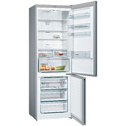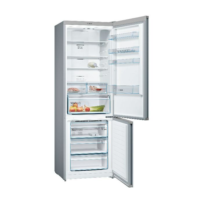 Bosch KGN49XLEA Samostojeći hladnjak sa zamrzivačem na dnu Vrata: Inox-look, stranice: sive (VZF 07127) Vertikalna ručka LED s Soft Start osvjetljenje hladnjaka Desno otvaranje vrata, podesivo Zasebna elektronička regulacija temperature s LED prikazom Odvojeno upravljanje temperature u rashladnom i zamrzivačkom dijelu VitaFresh ladica s podešavanjem vlažnosti - voće i povrće ostaju duže svježi Multi Airflow-System Br. površina za odlaganje od sigurnosnog stakla: 5 (podesive po visini: 4), od toga 4 na izvlačenje Br. velikih površina za odlaganje na vratima: 1, broj malih površina za odlaganje: 3 Super hlađenje 3 x Posuda za jaja, 1 x Posuda za ledene kocke Broj prozirnih pretinaca za zamrzavanje: 3 Manual/automatic activiation Kalendar za zamrznutu hranu Aktivni sigurnosni sistem NoFrost Optički i akustički sistem upozoravanja kod otvorenih vrata VarioZone - odstranjive police od sigurnosnog stakla za dodatan prostor Sprijeda noge podesive po visini, straga kotačići Dimenzije (V x Š x D): 203 x 70 x 67 cm Automatsko odmrzavanje hladnjaka Etažno zamrzavanje Razred energetske učinkovitosti (EU19_EEK_D): E Ukupna neto zapremnina aparata (l): 438 l Neto kapacitet hladnjaka (l): 330 l Neto kapacitet zamrzivača (I): 108 l Kapacitet zamrzavanja (kg/24h): 12 kg Prosječna godišnja potrošnja energije: 259 kWh/god Klimatski razred: SN-T Razina buke: 40 dB Vrijeme rasta temperature (h): 16 h Država porijekla: Turska