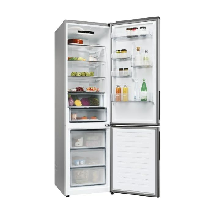Samostojeći hladnjak - ledenica dolje 2 vrata Tehnologija hlađenja: No Frost IoT App: hOn My Zone Humidity Zone Fresh zone Odmrzavanje ledenice: automatsko - No frost Odmrzavanje hladnjaka: automatsko Rasvjeta: LED Unutrašnja upravljačka ploča Upravljanje: elektroničko Boja: inox Integrirana ručka Šarka na vratima: desno Promjena smjera otvaranja vrata Klimatski razred: SN, N, ST Vrijeme čuvanja namirnica u slučaju nestanka struje (h): 11 Razred energetske učinkovitosti: E Godišnja potrošnja energije (kWh/god): 279 Razred emisije buke koja se prenosi zrakom: C Emisija buke koja se prenosi zrakom (dBA): 38 Zbroj zapremina odjeljaka za hlađenje (dm3 ili L): 289 Zbroj zapremina odjeljaka za zamrzavanje (dm3 ili L): 120 Ukupan zbroj zapremina svih odjeljaka (dm3 ili L): 409 Visina (mm): 2050 Širina (mm): 595 Dubina (mm): 667 Neto težina (kg): 78
