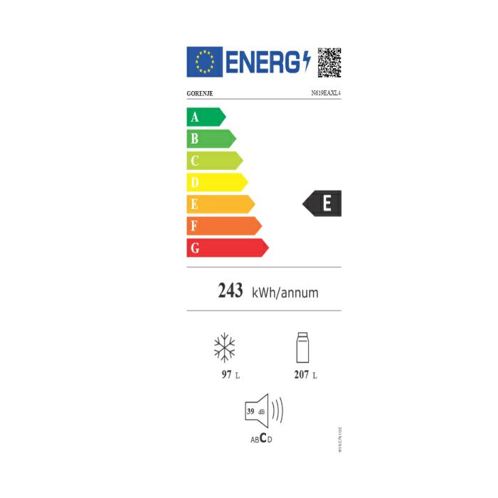 Materijal vrata Kolaminirani čelik Otvaranje vrata Desno promjenjivo Broj vrata 2 Vrsta baze 2 kotačića/2 podesive noge Broj zvjezdica Svježa hrana, 4 zvjezdice Klimatski razredi Subnormalna, Normalna, Subtropska, Tropska Ukupni volumen 304 l Obujam rashladnog dijela 207 l Obujam zamrzivačkog dijela 97 l Kapacitet zamrzavanja u 24 sata 6 kg Vrijeme čuvanja u slučaju nestanka el.energije 10 h Procijenjena godišnja potrošnja električne energije 243 kWh Tip zaslona LED zaslon Vrsta upravljanja Elektronsko na vratima Indikator temperature SensoTech sklopka Odleđivanje rashladnog dijela Automatsko Odleđivanje zamrzvačkog dijela Automatsko Regulator vlažnosti CrispZone s HumidityControl: velika ladica za povrće s regulacijom vlažnosti NoFrost NoFrost Plus Kruženje zraka MultiFlow hlađenje u hladnjaku Štedljivi program EcoMode Da Polica za boce u vratima 1 polica za boce bez držača Police na vratima hladnjaka 2 police na vratima Osvjetljenje unutrašnjosti rashladnog dijela LED osvjetljenje na stropu Broj premjestivih polica u odjeljku hladnjaka 2 kom Broj staklenih polica u rashladnom dijelu 2 kom Posudica za jaja 2/12 Podrum (0 zona) Convert FreshZone Posudica za led 1 klasična posudica za led Prostor za zamrzavanje 3 ladice Osvjetljenje zamrzivačkog dijela Nema osvjetljenja Razina buke (max.) 39 dB(A) Broj kompresora 1 kompresor Rashladna tekućina R600a Broj neovisnih rashladnih sustava 1 Širina proizvoda 595 mm Visina proizvoda 1860 mm Dubina proizvoda 590 mm Bruto težina proizvoda 69 kg Neto težina proizvoda 60 kg Širina zapakiranog proizvoda 645 mm Visina zapakiranog proizvoda 1935 mm Dubina zapakiranog proizvoda 628 mm Priključni napon 220-240 V Frekvencija 50 Hz