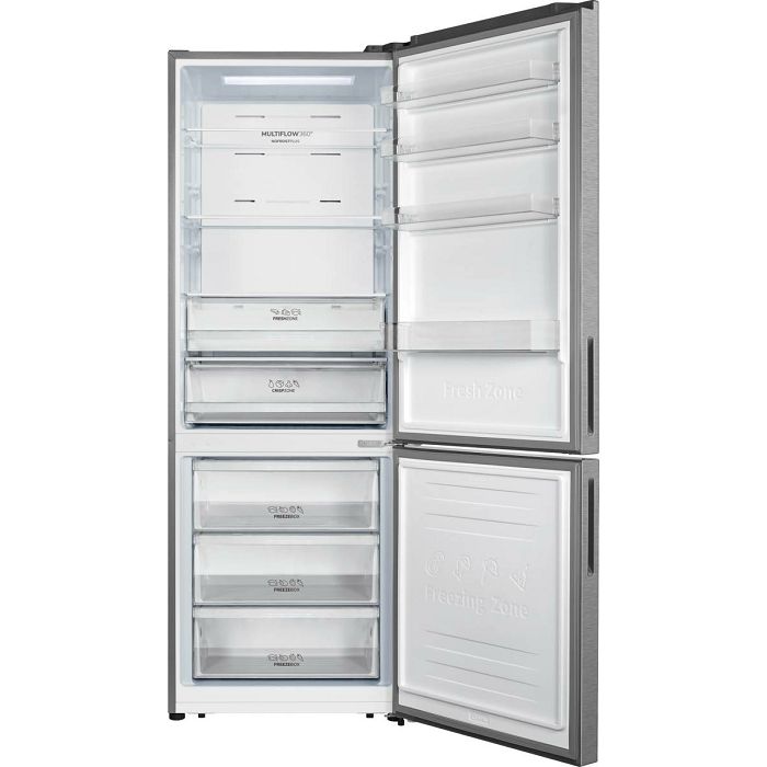Advanced Line Energetski razred: E Energetski razred buke: C Boja aparata: siva Boja vrata: siva Otvaranje vrata: desno promjenjivo Ukupni volumen: 495 l Obujam rashladnog dijela: 345 l Obujam zamrzivačkog dijela: 150 l Kapacitet zamrzavanja u 24 sata: 10 kg Vrijeme čuvanja u slučaju nestanka el.energije: 12 h Procijenjena godišnja potrošnja električne energije: 297.84 kWh Vrsta upravljanja: elektronsko na vratima Odleđivanje rashladnog dijela: automatsko Odleđivanje zamrzvačkog dijela: automatsko NoFrost Plus MultiFlow hlađenje u hladnjaku Razina buke (max.): 39 dB(A) 1 inverterski kompresor Rashladna tekućina: R600a Širina proizvoda: 704 mm Visina proizvoda: 2000 mm Dubina proizvoda: 694 mm Bruto težina proizvoda: 97 kg Neto težina proizvoda: 88 kg