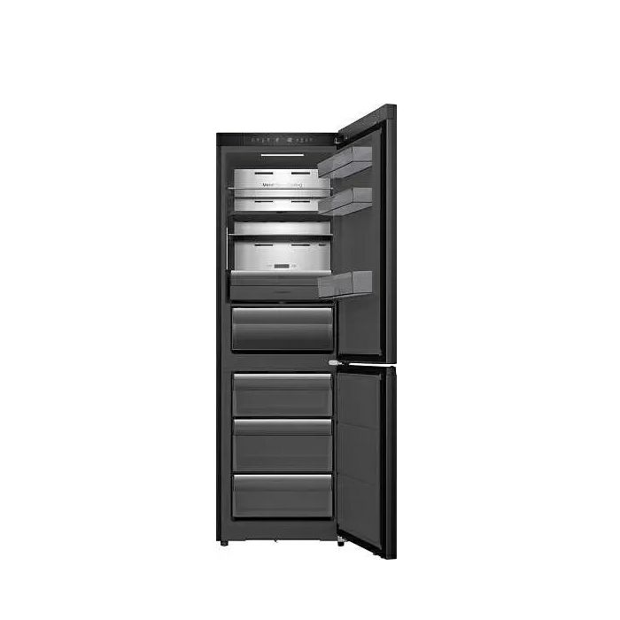 Tip konstrukcije Samostojeća Energetski razred D Energetski razred buke B Lokacija zamrzivačkog dijela Ispod Boja aparata Crna Boja vrata Crna Materijal vrata Lakirana Otvaranje vrata Desno promjenjivo Broj vrata 2 Vrsta baze 2 kotačića/2 podesive noge Broj zvjezdica Svježa hrana, Hlađenje, 4 zvjezdice Klimatski razredi Subnormalna, Normalna, Subtropska, Tropska Ukupni volumen 330 l Obujam rashladnog dijela 190 l Zapremnina rashladnog pretinca 25 l Obujam zamrzivačkog dijela 115 l Kapacitet zamrzavanja u 24 sata 10 kg Vrijeme čuvanja u slučaju nestanka el.energije 12 h Procijenjena godišnja potrošnja električne energije 208 kWh Moguće upravljanje putem Wi-Fi mreže Da, integrirano Tip zaslona LED zaslon Vrsta upravljanja Elektronsko iza vrata Indikator temperature Digitalni pokazivač temperature u rashladnom i zamrzivačkom dijelu Previsoka tempratura u zamrzivačkom dijelu Zvučni alarm Namjestiva temperatura u zamrzivaču Da Odleđivanje rashladnog dijela Automatsko Odleđivanje zamrzvačkog dijela Automatsko Bravica na vratima Ne Regulator vlažnosti Moisture Fresh Crisper and Fresh Crisper No Frost Total No frost Kruženje zraka Multi Air Flow Eko način rada Ne Dispenzer za hladnu vodu Ne Nosač boca Stalak za vino Police na vratima hladnjaka 3 police u vratima Osvjetljenje unutrašnjosti rashladnog dijela LED osvjetljenje na stropu Automatski ledomat Ne Broj premjestivih polica u odjeljku hladnjaka 2 kom Broj staklenih polica u rashladnom dijelu 4 kom Posudice za led Ne Prostor za zamrzavanje 3 ladice Osvjetljenje zamrzivačkog dijela Nema osvjetljenja Razina buke (max.) 35 dB(A) Broj kompresora 1 inverterski kompresor Priključak za vodu Ne Rashladna tekućina R600a Broj neovisnih rashladnih sustava 1 Širina proizvoda 595 mm Visina proizvoda 1856 mm Dubina proizvoda 600 mm Bruto težina proizvoda 71 kg Neto težina proizvoda 65 kg Širina zapakiranog proizvoda 645 mm Visina zapakiranog proizvoda 1988 mm Dubina zapakiranog proizvoda 650 mm Priključni napon 220-240 V Frekvencija 50 Hz Priključna snaga 128 W