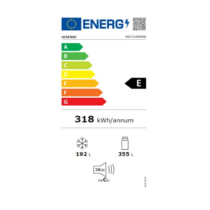 Samostojeći Side-by-side hladnjak/zamrzivač, ukupnog volumena 547 l (hladnjak 355 l i zamrzivač 192 l). Dimenzije uređaja (ŠxVxD): 91,5x178,6x67 cm. Energetski razred: E.