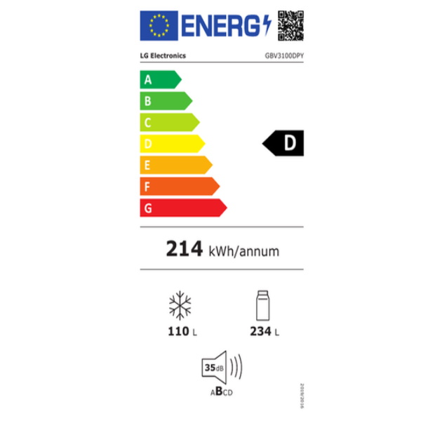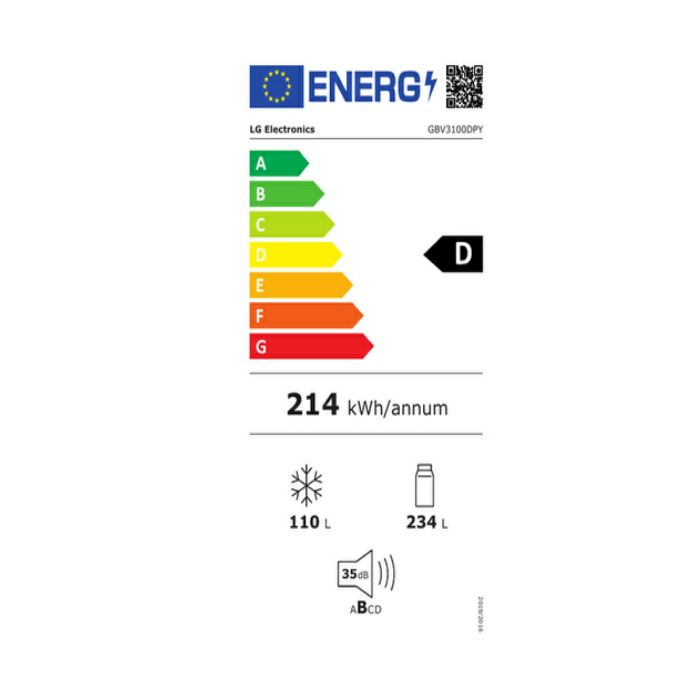 Hladnjak kombinirani LG GBV3100DPY Vrsta proizvoda B/Zamrzivač Dubina: Klasična Energetski razred: D (A - G skala) KAPACITET Ukupni volumen (L): 344 Volumen zamrzivača (L): 110 Kapacitet hladnjaka (L): 234