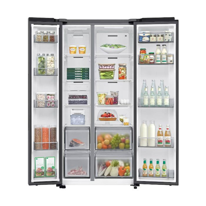 SAMSUNG hladnjak SBS RS70F65QETEO (E) AI Mat Silver Metal Prostranost i pametna ušteda energije Ovaj frižider s kapacitetom od 640 litara pruža izdašan prostor za čuvanje svih vaših namirnica, zahvaljujući inovativnoj SpaceMax tehnologiji koja omogućava tanje zidove bez ugrožavanja energetske efikasnosti. Inteligentni AI energetski režim automatski prilagođava brzinu kompresora i ciklus odmrzavanja, pomažući vam smanjiti potrošnju energije do 10%, čime štedi i vaš novac i okoliš.