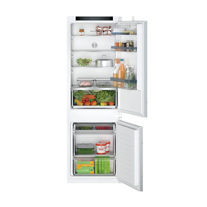Bosch KIV86VSE0 Ugradbeni hladnjak sa zamrzivačem na dnu, 177.2 x 54.1 cm LED osvjetljenje hladnjaka Elektronička regulacija temperature s LED prikazom Super zamrzavanje sa automatikom Akustički sistem upozoravanja kod otvorenih vrata Broj površina za odlaganje od sigurnosnog stakla: 4, od toga podesive po visini: 3 Br. velikih površina za odlaganje na vratima: 3, od toga 1 ladica za maslac / sir Broj polica za odlaganje u vratima: 3 VitaFresh ladica s podešavanjem vlažnosti - voće i povrće ostaju duže svježi Br. prozirnih ladica za zamrzavanje: 3, od toga 1 BigBox Dimenzije (V x Š x D): 177 x 54 x 55 cm Ugradbene dimenzije (V x Š x D): 177.5 x 56 x 55 cm Desno otvaranje vrata, podesivo Razred energetske učinkovitosti: E Ukupna neto zapremnina aparata: 267 l Neto kapacitet hladnjaka: 183 l Neto kapacitet zamrzivača: 84 l Kapacitet zamrzavanja (kg/24h): 4.2 kg Prosječna godišnja potrošnja energije: 229 kWh/god Klimatski razred: SN-ST Razina buke: 35 dB Vrijeme rasta temperature (h): 9 h Low Frost Klizna šarka Država porijekla: Njemačka