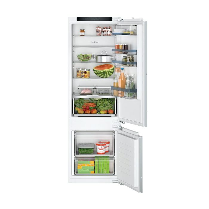 Bosch KIV87VFE0 Ugradbeni hladnjak sa zamrzivačem na dnu, 177.2 x 54.1 cm LED osvjetljenje hladnjaka Elektronička regulacija temperature s LED prikazom Super zamrzavanje sa automatikom Akustički sistem upozoravanja kod otvorenih vrata Broj površina za odlaganje od sigurnosnog stakla: 5, od toga podesive po visini: 4 Br. velikih površina za odlaganje na vratima: 4, od toga 1 ladica za maslac / sir Broj polica za odlaganje u vratima: 1 Broj polica za odlaganje u vratima: 4 VitaFresh ladica s podešavanjem vlažnosti - voće i povrće ostaju duže svježi Low Frost Br. prozirnih ladica za zamrzavanje: 2, od toga 1 BigBox Dimenzije (V x Š x D): 177 x 54 x 55 cm Ugradbene dimenzije (V x Š x D): 177.5 x 56 x 55 cm Desno otvaranje vrata, podesivo Razred energetske učinkovitosti: E Ukupna neto zapremnina aparata: 270 l Neto kapacitet hladnjaka: 200 l Neto kapacitet zamrzivača: 70 l Kapacitet zamrzavanja (kg/24h): 3.2 kg Prosječna godišnja potrošnja energije: 216 kWh/god Klimatski razred: SN-ST Razina buke: 35 dB Vrijeme rasta temperature (h): 12 h Država porijekla: Njemačka
