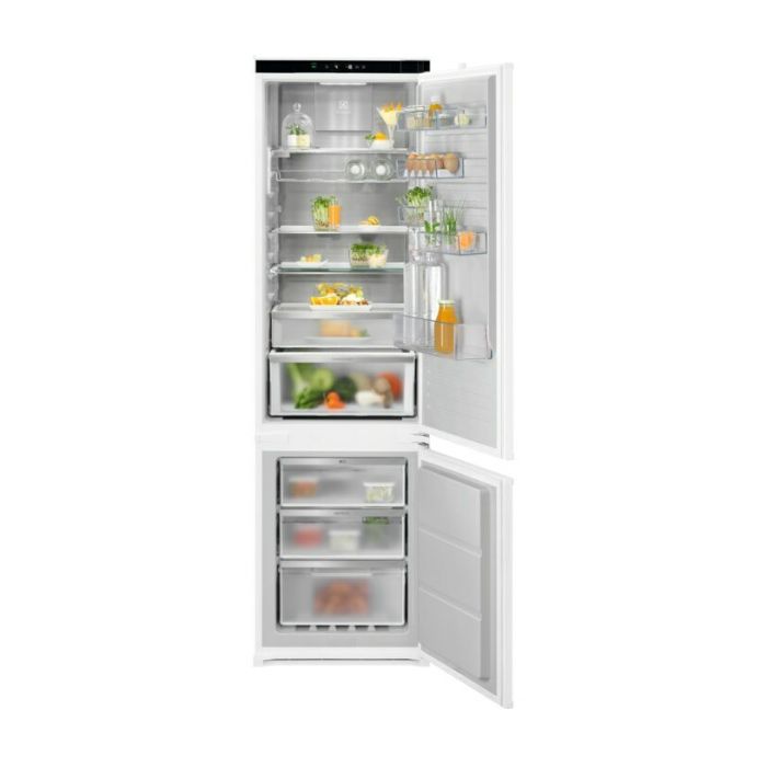 Za potpuno ugradbeni hladnjak, klizna montažna vrata Neto zapremnina odjeljka za zamrzavanje, l: 61 Neto zapremnina hladnjaka, l: 192 Automatsko odmrzavanje zamrzivača Automatsko odmrzavanje rashladnog pretinca Funkcija brzog zamrzavanja brzo osigurava željenu temperaturu hlađenja Funkcija brzog zamrzavanja brzo zamrzava namirnice te čuva okus i vitamine Holiday funkcija; minimalizira se potrošnja energije za vrijeme duljeg odsustva i sprečava nastajanje plijesni i neugodnih mirisa Zvučni i svjetlosni alarm visoke temperature Vizualni i zvučni signal upozorenja otvorenih vrata Odvojene kontrole odjeljka zamrzivača i hladnjaka Osvjetljenje hladnjaka: 1, Luna Police zamrzivača: 2, široka, staklena Broj i vrsta ladica zamrzivača: 3 široke Posebna polica za boce Položaj šarki na vratima: desno, mogućnost promjene smjera otvaranja vrata Energetska klasa: C Funkcija 'Brzo zamrzavanje' s automatskim vraćanjem na normalnu postavku Funkcija 'Shopping' brzo osigurava željenu temperaturu hlađenja Elektronske kontrole na dodir sa digitalnim pokazivačem Dimenzije V׊×D (mm): 1884 x 546 x 549 Dimenzije za ugradnju VxŠxD (mm): 1894 x 560 x 550