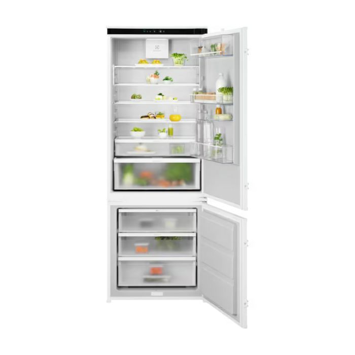 Electrolux ENG7TE75S Ugradbeni kombinirani hladnjak 700 GreenZone MaxiSpace sa ledenicom dolje Širina: 70 cm MaxiSpace Hladnjak: 284 l Ledenica: 87 l No Frost Energetska klasa E(20): E Buka: 35 dB TwinTech - odvojeno hlađenje hladnjaka (klasično hlađenje) i ledenice No Frost (hlađenje zrakom) Kompresor promjenjive brzine Održavanje u slučaju nestanka struje hladnjak E(20): 15 h Elektronske kontrole na dodir sa LCD-om iza vrata, sa Off zaštitom od djece Svijetlo: LED, 1 gore + 2 trake sa strane Brzo zamrzavanje - Auto Return 10,5 kg/ 24 h Intenzivno hlađenje novih namirnica Audio vizualni indikator porasta temperature i otvorenih vrata DynamicAir - radijalni ventilator ravnomjernog hlađenja GreenZone ExtraZone Unutrašnjost hladnjaka i ledenice od 70% reciklirane plastike Fleksibilna ledenica sa 3 velike ladice Bijela vrata - desna ili lijeva Potpuna klizna ugradnja Dimenzije u cm: 188.4 V x 69,6 Š x 54,9 D