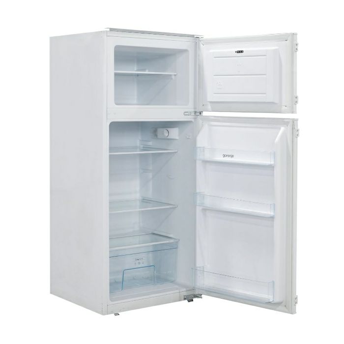 Energetski razred: E Energetski razred buke: C Lokacija zamrzivačkog dijela: gore Boja aparata: bijela Otvaranje vrata: desno promjenjivo Klizni panti vrata Broj vrata: 2 2 fiksne noge/ 2 podesive noge Ukupni volumen: 170 l Obujam rashladnog dijela: 135 l Obujam zamrzivačkog dijela: 35 l Kapacitet zamrzavanja u 24 sata: 2.6 kg Vrijeme čuvanja u slučaju nestanka el.energije: 12 h Procijenjena godišnja potrošnja električne energije: 175 kWh Vrsta upravljanja: mehaničko Odleđivanje rashladnog dijela: automatsko Odleđivanje zamrzvačkog dijela: ručno 1 polica za boce bez držača 1 posuda u vratima 1 gornja ladica na vratima Osvjetljenje unutrašnjosti rashladnog dijela: LED osvjetljenje Razina buke (max.): 39 dB(A) Broj kompresora: 1 kompresor Rashladna tekućina: R600a Polaganje aparata: dopušteno Broj neovisnih rashladnih sustava: 1 Širina proizvoda: 540 mm Visina proizvoda: 1221 mm Dubina proizvoda: 540 mm Neto težina proizvoda: 36 kg