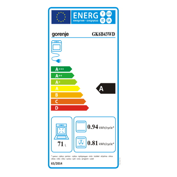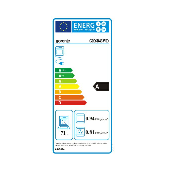 Svaki put ravnomjerno pečeno Gorenje pećnice poznate su po svojoj inovativnoj zaobljenoj unutrašnjosti, što je njihova prepoznatljiva karakteristika dugi niz godina. HomeMade dizajn inspirisan je tradicionalnim pećima na drva i pruža bolju cirkulaciju zraka u odnosu na konkurente. Sada je HomeMade oblik potpuno redizajniran i protok zraka je poboljšan zahvaljujući novom dizajnu grijača i poboljšanoj distribuciji otvora za ventilaciju. Zbog toga je temperatura ravnomjerno raspoređena po cijeloj pećnici. Nikada više vaša jela neće biti prepečena s jedne strane i nedovoljno pečena s druge strane. Savršeno sa svih strana MultiAir tehnologija garantira optimalnu cirkulaciju topline unutar pećnice. Zahvaljujući pametno pozicioniranim otvorima za ventilaciju na zadnjoj strani i jedinstvenom zaobljenom obliku, zrak se ravnomjerno širi po cijeloj pećnici. Ventilator raspršuje vrući zrak unutar cijele zapremine pećnice, čineći hranu savršeno pečenom sa svih strana. Dinamično kretanje zraka također omogućava istovremeno pečenje na više nivoa bez miješanja mirisa i okusa. Jednostavno i lako čišćenje AquaClean pruža veliku pomoć u čišćenju pećnice. Sve što treba je da nalijte pola litra vode u posudu za pečenje i uključite AquaClean nakon svakog pečenja. Za samo 30 minuta, rezultati će biti vidljivi na čitavoj površini i posudama za pečenje. Mrlje i mast će omekšati tako da ih možete jednostavno obrisati. Dovoljno prostora za sva vaša jela Spremni za XXL recepte? Inovativno dizajnersko rješenje omogućava veću unutrašnjost, a koristi se puna zapremina pećnice. Svaka posuda za pečenje ima više prostora a superiorna tehnologija će se pobrinuti da je hrana jednako pečena na svim nivoima. Dovoljno prostora za svaku tavu i posudu Veći prostor za kuhanje i veća razdaljina između lonaca nudi dovoljno prostora za tave i lonce svih veličina. Ravan dizajn omogućava lako klizanje i korištenje velikih posuda bez problema, uz savršenu stabilnost za sve vaše kulinarske avanture. Jednostavno i efikasno odleđivanje Gorenje štednjaci s pećnicom ističu se efikasnom funkcijom odleđivanja koja će ravnomjerno odlediti svaki duboko smrznuti proizvod. Jednostavno namjestite vrijeme i hranu ostavite u pećnici! Tehničke karakteristike Općenito Vrsta uređaja:Kombinirani štednjak Energetski razred:A Boja:Bijela Tip ploče za kuhanje:Kombinirana Materijal upravljačke ploče:Lakirani metal Materijal vrata:Staklo Unutrašnjost spremnika:SilverMatte Materijal poklopca:Without lid Pant vrata:Klasični HomeMade oblik:Da Učinkovitost Iskoristivi obujam pećnice:71 l Vrsta pećnice:Ventilatorska Površina najveće posude za pečenje:1316 cm2 Upravljanje:Timer funkcija Mehanički isklopni minutni sat:Oblik gumba Ergonomski gumbi:Paljenje plinskih plamenika Električno jednoručno paljenje plinskih plamenika:Zone za kuhanje Zona za kuhanje sprijeda lijevo:Mali plamenik O lijevo sprijeda (mm):54 Snaga zona za kuhanje lijevo sprijeda:1000 W Zona za kuhanje sprijeda desno:Veliki plamenik O desno sprijeda (mm):99 Snaga zona za kuhanje desno sprijeda:3000 W Zona za kuhanje straga lijevo:Brzogrijuća ploča O lijevo straga (mm):180 Snaga zone za kuhanje lijevo straga:2000 W Zona za kuhanje straga desno:Srednji plinski plamenik O desno straga (mm):74 Snaga zone za kuhanje desno straga:1900 W Izvedba nosivih rešetki:Emajlirana Načini zagrijavanja Brzo predzagrijavanje Konvencionalno s ventilatorom Donji i gornji grijač Veliki infracrveni grijač s ventilatorom Veliki infracrveni grijač Pizza funkcija Pečenje zamrznutih namirnica Odleđivanje AquaClean Karakteristike Osvjetljenje pećnice:Iza Preklopni gornji grijač za olakšano čišćenje:Ne MultiAir:Da Oprema Vodilice posuda za pečenje:Žičane vodilice Komplet ražnja:Ne Posude za pečenje: 1 duboka emajlirana posuda za pečenje 1 plitka emajlirana posuda za pečenje Rešetka pećnice:1 kom Sonda za meso:Ne Križ za nosivu rešetku:Ne Filter za masnoću:Ne Zatvorene mlaznice za plin:G20/20 prirodni plin Vrsta plina:G30/30 za propan butan Sigurnosni sustavi Vrata:Dvostruka vrata pećnice s 1-strukom temperaturnom refleksijom Temperatura vrata pećnice:CompactDoor Blokada vratiju:Ne Signalizacija preostale topline:Ne Jednostavno čišćenje Katalitičko:Ne Tehnički podaci Energy consumption conventional oven:0.941 kWh Potrošnja energije (ventilatorska):0.81 kWh Priključna snaga:4.8 kW Širina proizvoda:600 mm Visina proizvoda:850 mm Dubina proizvoda:600 mm Širina zapakiranog proizvoda:676 mm Visina zapakiranog proizvoda:952 mm Dubina zapakiranog proizvoda:718 mm Bruto težina proizvoda:47.3 kg Neto težina proizvoda:43.9 kg Frekvencija:50 Hz, 60 Hz Priključni napon:220-240 V Vrsta priključka:AC 230V/400V
