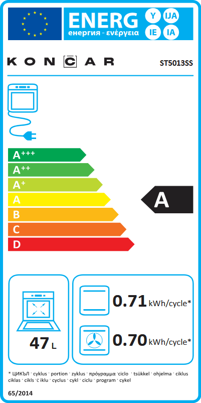 Razred energetske učinkovitosti: A Potrošnja energije – klasični način grijanja: 0,71 kWh Potrošnja energije – grijanje s prisilnim kruženjem zraka: 0,70 kWh Korisni volumen prostora za pečenje: 47 L