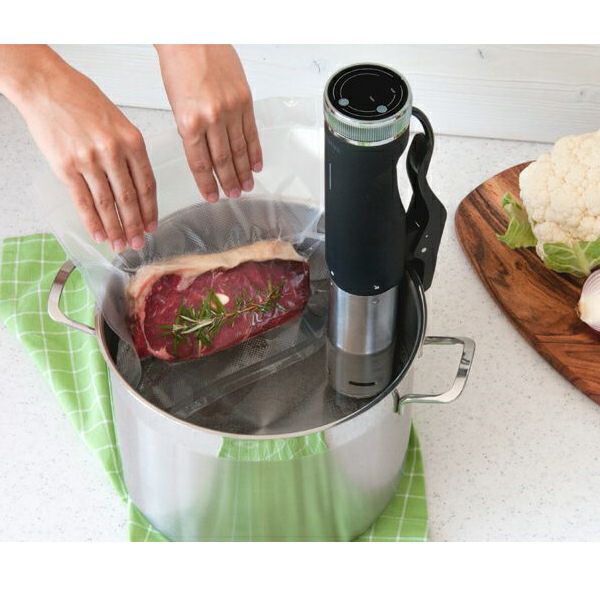 Status Sous Vide SVC100 kuhalo za sporo kuhanje Priuštite svojoj obitelji i prijateljima vrhunska jela Iznimno točno mjerenje temperature, do 0,1 °C Nazivna snaga 800 W Težina samo 1,18 kg Vrijeme djelovanja do 99 sati i 59 minuta