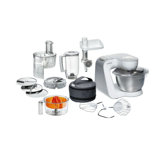 MUM54251 kuhinjski stroj Bosch Kuhinjski ureĎaj Styline Priključna snaga: 900 W Posuda za miješanje od nehrđajućeg čelika zapremine 3.9 l 7 radnih brzina, trenutni stupanj Zaštita od ponovnog neželjenog uključenja Ploča za rezanje (debelo i tanko) Ploča za struganje (grubo i fino) Ploča za ribanje (srednji stupanj) Metlica za stepanje Metlica za gnječenje Metlica za miješanje Plastična miješalica zapremine 1.5 l Mesoreznica Cjediljka za agrume Nastavak za rezanje na kockice Interaktivni DVD sa receptima Dimenzije proizvoda (mm): 282 x 280 x 271