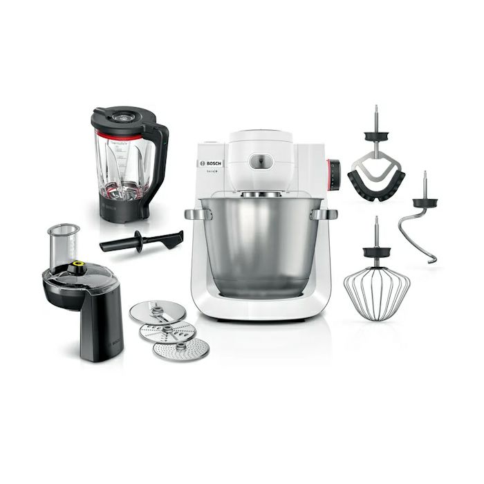 Snaga (W): 1600 W Broj postavki brzine: 7 Glavna boja proizvoda: bijela Materijal kućišta: plastika s nehrđajućim čelikom Materijal posude: nehrđajući čelik Iskoristiv kapacitet: 5.5 l Maks. masa posude za miješanje brašna: 1.5 kg Maks. količina obrade tijesta: 3.5 kg Dimenzije proizvoda: 330x320x380 mm Neto težina: 12.7 kg Dužina kabela za napajanje: 110.0 cm Uključeni dodatni pribor: 1 x Poklopac, 1 x Protočni sjekač, 1 x Posuda za miješanje od nehrđajućeg čelik, 1 x Vrč za miješanje, staklen, 1 x Kombinirana ploča za struganje, 1 x Ploča za struganje, srednje fina, 1 x Kombinirana ploča za rezanje, 1 x Pomagalo za punjenje, 1 x Metlica za gnječenje, nehrđajući čelik