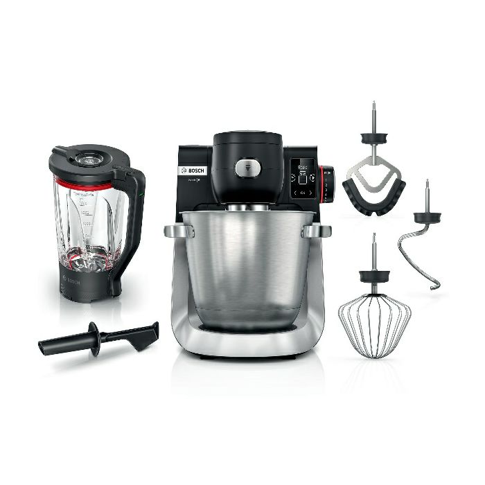 Posebno velika zdjela od brušenog nerđajućeg čelika kapaciteta 5,5 l, opremljena s dvije ergonomske ručke za do 3,5 kg smjese za kolače ili 2,5 kg tijesta za kruh. Savšena djelotvornost tučenja s povećanom stabilnošću pjenjače i novim visokokvalitetnim dizajnom - savršeno pristaje obliku zdjele Poklopac za zaštitu od prskanja napravljen je od izdržljivog tritana otpornog na udarce i bez BPA, te opremljen otvorom za punjenje. Poklopac ostaje podignut prilikom dizanja ručice i može se jednostavno ukloniti. Aplikacija Home Connect: Pristup ukusnim receptima i savjetima razvijenim za Seriju 6 za uspješno postizanje savršenih rezultata Uključen stakleni blender ThermoSafe debelih stjenki zapremnine 2,3 l (s hranom: 1,5 l) za jednostavno i sigurno miješanje vrućih juha i ledenih pića bez buke zahvaljujući posebnom obliku