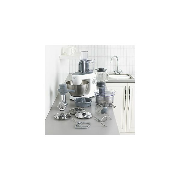 KHH326WH MultiOne Kuhinjski stroj Kenwood Materijal blendera: staklo Sokovnik Nastavak za mljevenje mesa Citruseta Kuka za tijesto Pjenilica Diskovi za rezanje i ribanje Snaga: 1000 W Boja: bijela Težina: 5,2 kg Elektronička kontrola brzine Zaštita protiv prskanja Lopatica Kapacitet posude: 4,3 l