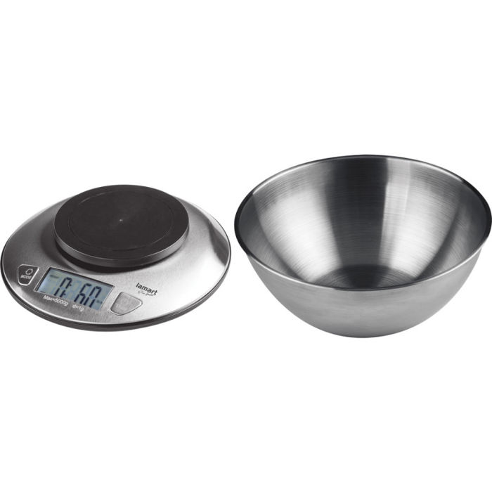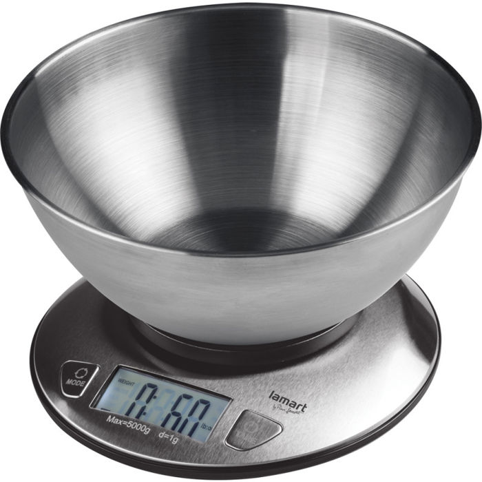 Kuhinjska vaga od nehrđajućeg čelika s LCD zaslonom i zdjelom JUSTLamart LT7070 Kuhinjska vaga izrađena je od kvalitetnog nehrđajućeg čelika, uključujući uklonjivu zdjelu kapaciteta 2000ml. Rezultat mjerenja možete vidjeti na LCD zaslonu s pozadinskim osvjetljenjem.Pomoću TARE funkcije možete vagati sirovine ili oduzimati težinu spremnika od ukupne težine.Vaga vam omogućuje vaganje ne samo u gramima i kilogramima, već i u programu mjerenja mlijeka i vode također u mililitrima i uncama.Kapacitet do 5 kg (točnost 1 g).Slaba baterija i indikacija preopterećenja.Izbor jedinica (g/ml/lb/fl:oz).Baterija: 2× AAA baterija od 1,5 V, nije uključenaPravokutni oblik Veličina 21,5 × 21,5 × 13 cmMaterijal nehrđajući čelikBoja siva