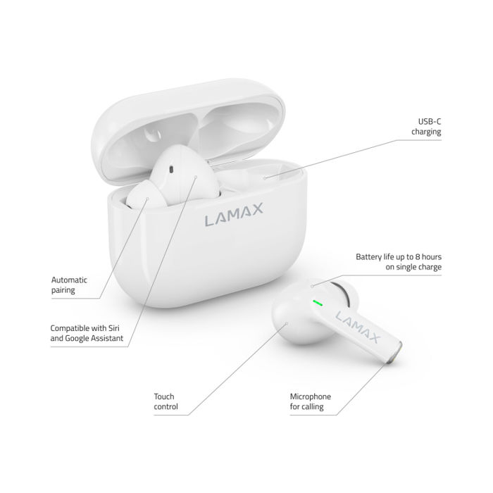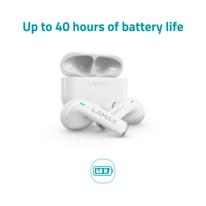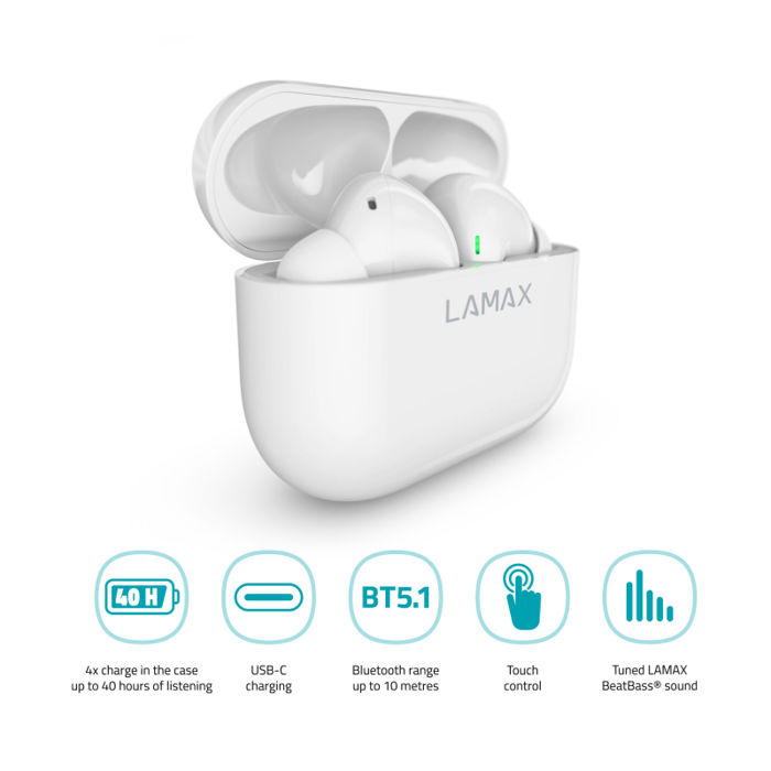 LAMAX Clips1 White - Moderne slušalice za svaki dan Zvučni zapis uljepšava dan LAMAX Clips1 oduševit će vas savršenim zvukom LAMAX BeatBass® kad god ih instalirate. Učitajte novi popis za reprodukciju i slušajte masivni ritam! Uz najnoviji Bluetooth 5.1 i AAC kodek, vaše će pjesme s vašeg telefona doći do vaših slušalica u najvišoj kvaliteti. Prebacujte se između njih brzinom munje s kontrolom na dodir. Utikači se spajaju čim ih izvadite iz kućišta.