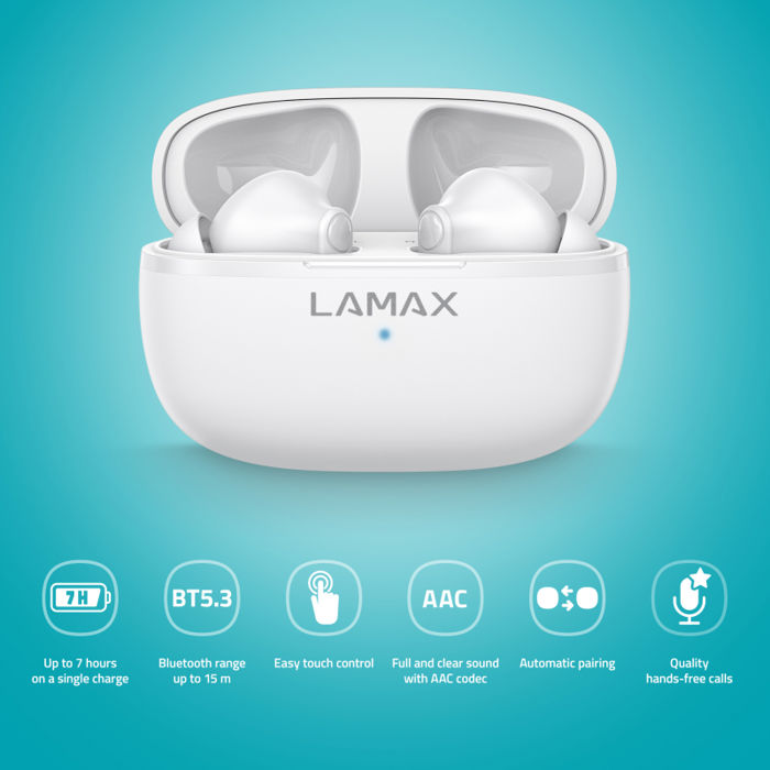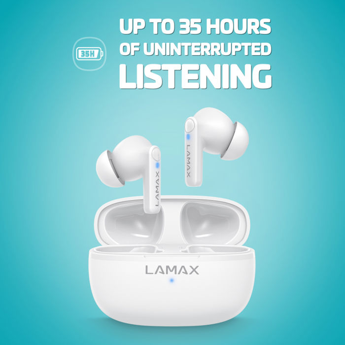 LAMAX Clips1 Play White - zvuk i stil bez premca Brzina i izdržljivost Izvrsne slušalice zahtijevaju čist i uravnotežen zvuk; to je neizbježno. Uz Bluetooth 5.3 tehnologiju, najsvježiji ritmovi na vašem popisu za reprodukciju oživjet će odmah. Uživajte u 7 sati reprodukcije s jednim punjenjem, u vašem slučaju imate sljedećih 28 sati. Jeste li bez energije? Ne brinite, iz prazne se pune uz brzo punjenje od 70 minuta.