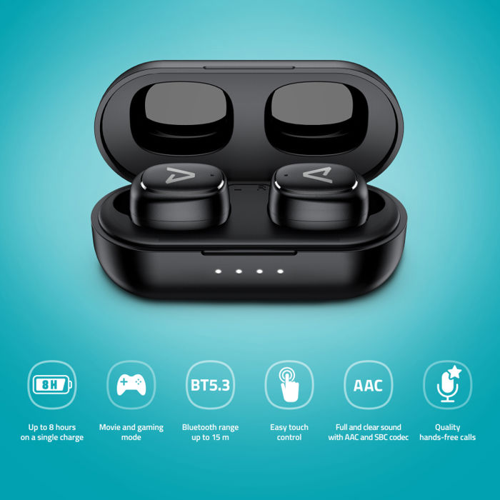 Tehničke specifikacije Vrsta slušalica In-ear Kontrola taktilna Bluetooth 5.3 bežična tehnologija Podržani AAC, SBC kodeci Domet Bluetooth veze Do 15 m Frekvencijski raspon 20 Hz – 20 kHz Veličina drajvera 8 mm Kapacitet baterije kućišta za punjenje 300 mAh Kapacitet baterije za slušalice 38 mAh Vrijeme reprodukcije Volume 50% - 8 h Volumen 80% - 6 h Ukupno vrijeme slušanja 38 h Vrijeme potpunog punjenja slušalica 60 min Vrijeme potpunog punjenja kutije 90 min USB-C povezivost za punjenje Značajke Ugrađeni mikrofon (s kontrolom poziva - javljanje/odbijanje i prekidanje poziva), mogućnost korištenja samo jedne slušalice, LED indikator, ergonomski dizajn, otpornost na znoj i vlagu Težina 3 g (jedna slušalica), 34 g (sa str