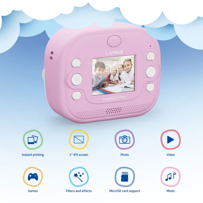 LAMAX InstaKid2 Play dolazi s markerima u boji , tako da djeca mogu ukrašavati svoje fotografije kako god žele – pretvarajući svaku snimku u jedinstvenu kreaciju. A kada malim kreativcima treba pauza od fotografiranja, čeka ih još zabave u obliku pet jednostavnih igara ugrađenih u fotoaparat. Bilo da se igraju fotografa ili sanjaju da postanu redatelji, zabava s ovim fotoaparatom nikad ne prestaje.