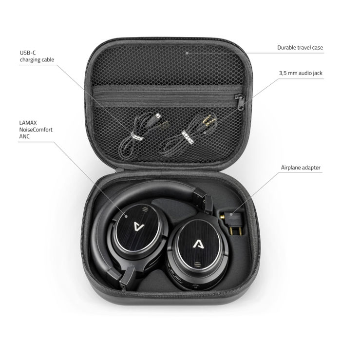 bežične Bluetooth 5.0 slušalice lamax noisecomfort anc anc tehnologija aktivno potiskivanje buke 26 sati vremena punjenja izdržljiva putna torbica usklađena točnost zvuka s metalnim dijelovima do 15 m sklopiva konstrukcija za jednostavno prenošenje