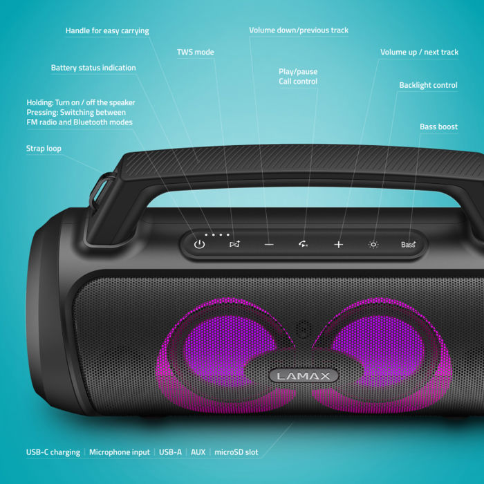 Bluetooth 5.3 LAMAX BeatBass® tehnologija Zahvaljujući ovoj tehnologiji, zvučnik ima snažan, pun i bogat zvuk. Osim toga, možete isključiti ili uključiti poboljšanje basa na upravljačkoj ploči.