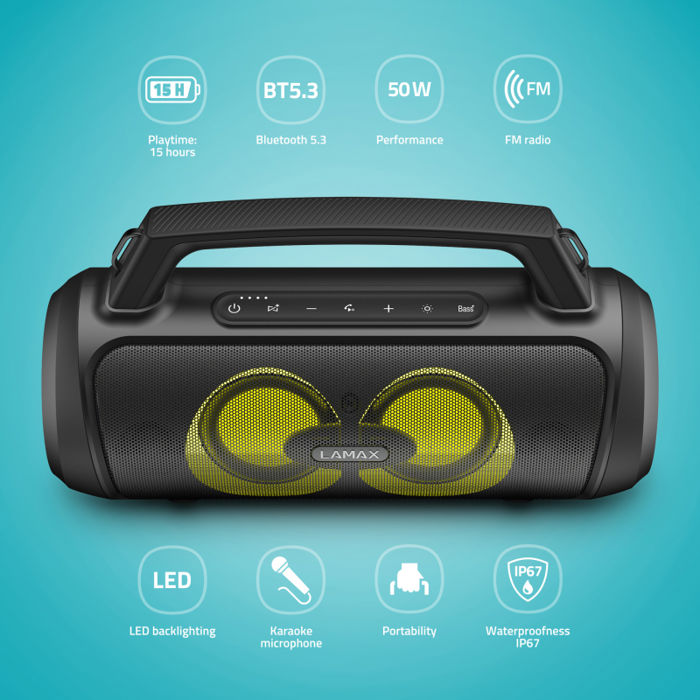 LAMAX PartyGo1 Igrajte Malo tijelo i velika snaga koja ugađa čak i radio Postavite ton za svaku zabavu uz prijenosni zvučnik LAMAX PartyGo1 Play. Njegovo malo tijelo s praktičnom ručkom krije znatnu snagu od 50 W. Gdje god ga zamislite, poslužit će vas snažnim, punim i bogatim zvukom zahvaljujući BeatBass® tehnologiji. Bilo da se radi o pravoj zabavi ili roštilju u vrtu, 3 načina LED pozadinskog osvjetljenja i priloženi mikrofon uvijek će im pružiti pravu atmosferu za uživanje u izvrsnim karaokama ili organiziranje događaja. Bluetooth 5.3 osigurava trenutno uparivanje zvučnika s bilo kojim uređajem i osigurava prijenos bez grešaka do 18m, ali možete ga spojiti i putem USB-a, microSD-a ili AUX-a te ga možete pretvoriti u power bank putem USB-A ulaza. U dobroj glazbi možete uživati ??i dok ste u pokretu, baterija zvučnika traje do 15 sati, a zahvaljujući praktičnom remenu možete ga udobno nositi preko ramena. Ako vam jedan zvučnik nije dovoljan, možete ga jednostavno upariti s drugim pomoću tehnologije True Wireless. Nemate popis pjesama pri ruci? Koristite FM radio koji možete lako ugoditi. Zvučnik podržava glasovne asistente i može se koristiti za upravljanje telefonskim pozivima.