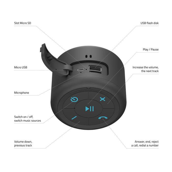 bežični zvučnik lamax sphere 2 5 W snaga u utoru microSD bluetooth 5.0 domet 10 m odličan zvuk prava bežična stereo funkcija za uparivanje s drugim zvučnikom za povećanje snage mala veličina Govornik za slobodu u pokretu Baterija će napajati zvučnik do 20 sati, što je puno dulje od usporedivih modela. Zato ga možete sigurno staviti u ruksak, čak i ako nemate dostupnu utičnicu. Nudi jednako dobru uslugu kod kuće kao i na putu. Mali i lagani zvučnik lako se nosi s praktičnom omčom na koju ga možete čak i objesiti. Bluetooth 5.0 pouzdano povezuje zvučnik s telefonom na udaljenosti do 10 metara. Ali imate i druge mogućnosti - LAMAX Sphere2 također prihvaća USB flash pogon i microSD karticu, a možete se prebaciti na radio i odabrati stanicu po svom izboru. Također možete telefonirati putem ugrađenog mikrofona, tako da ne morate vaditi mobitel.