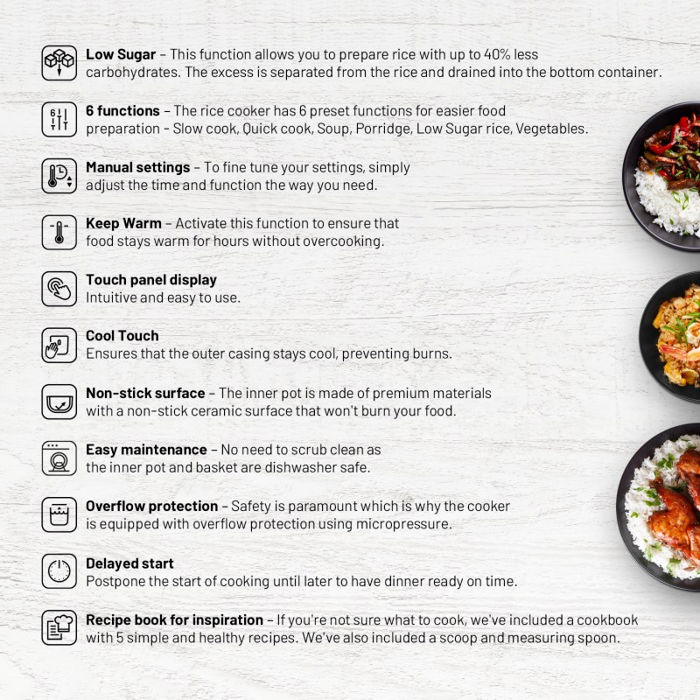 Ikone: Volumen 3 l Prilagodili smo se Vašim željama i povećali unutarnji volumen na 3 litre. Nizak šećer S ovom funkcijom pripremit ćete rižu s do 40% manje ugljikohidrata, višak će se odvojiti od riže i skupiti u vodi u donjoj posudi. Šest funkcija Kuhalo za rižu ima šest unaprijed postavljenih funkcija za lakšu pripremu jela - Sporo kuhanje, Brzo kuhanje, Juha, Kaša, Riža s niskim udjelom šećera, Povrće. Ručno podešavanje Ako vam vrijednosti unaprijed postavljenih funkcija ne odgovaraju, ništa vas ne sprječava da ručno postavite vrijeme i funkcije prema svojim željama. Zagrijati Aktiviranjem ove funkcije osigurat ćete da hrana ostane topla nekoliko sati bez da prekipi. Zaslon osjetljiv na dodir Upravljanje putem digitalnog zaslona osjetljivog na dodir vrlo je intuitivno i jednostavno. Cool Touch Ova tehnologija osigurava da vanjski kaput ostane hladan i nitko se na njemu ne može opeći. Neljepljiva površina Unutarnja posuda kuhala za rižu izrađena je od vrhunskog materijala s neljepljivom keramičkom površinom na koju se ništa ne lijepi. Jednostavno održavanje Unutarnji lonac i košara mogu se prati u perilici posuđa, tako da nećete morati brinuti o ribanju. Zaštita od prelijevanja Sigurnosti nikad dosta, pa je kuhalo za rižu opremljeno zaštitom od prelijevanja zahvaljujući mikrotlaku. Odgođeni start Odgodite početak kuhanja za kasnije kako biste večeru pripremili na vrijeme. Kuharica za inspiraciju Ako ne znate što skuhati, ideju možete pronaći u priloženoj kuharici s pet jednostavnih i zdravih recepata. Žlica i lopatica također su uključeni kao bonus.