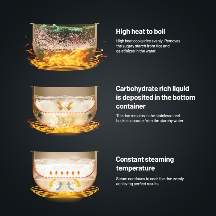 Kuhajte zdravije uz funkciju Low Sugar Pobornici zdravog načina života oduševit će se funkcijom niske razine šećera, koja zahvaljujući posebnoj tehnologiji odvaja višak šećera od škroba u riži tijekom kuhanja. Izdvojeni višak ugljikohidrata skuplja se u donju posudu i nakon završetka ciklusa jednostavno ih izlijete zajedno s vodom. Zakoračite prema zdravijoj prehrani s Lauben kuhalom za rižu s niskim udjelom šećera 3000AT i konzumirajte samo nutritivno bogate ugljikohidrate kako biste spriječili moguće buduće zdravstvene probleme uzrokovane pretjeranom konzumacijom viška šećera.